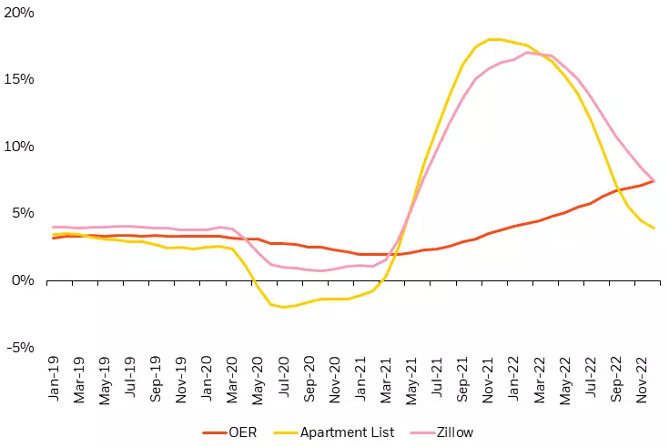 Source: BlackRock, with data from Apartment List and Zillow, January 2023.