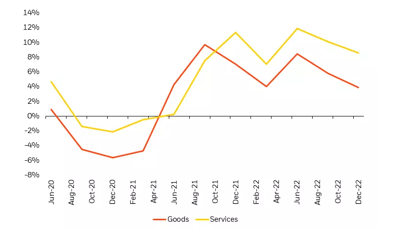 For the next phase of the tightening cycle, Fed officials have shifted their focus to labour markets. Wages have remained a persistent driver of broad-based services inflation since the economic reopening began. Historical periods of inflation have shown that reining in wage inflation is a critical step in restoring price stability and preventing long-run expectations from becoming unanchored. In early November, Fed Chairman Jerome Powell identified 3.5% wage growth as a targeted level that would be consistent with the Fed’s 2% inflation objective.